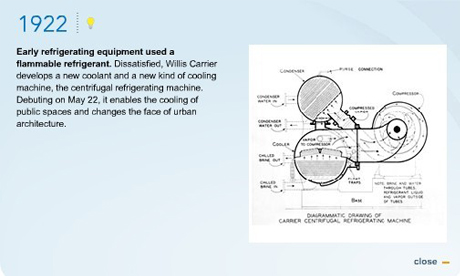 早期使用的制冷設備制冷劑易燃很令人不滿,威利斯.開利 開發一個新的冷卻劑和制冷機-離心式制冷機組。